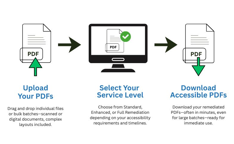 - Download your remediated PDFs—often in minutes, even for large batches—ready for immediate use.